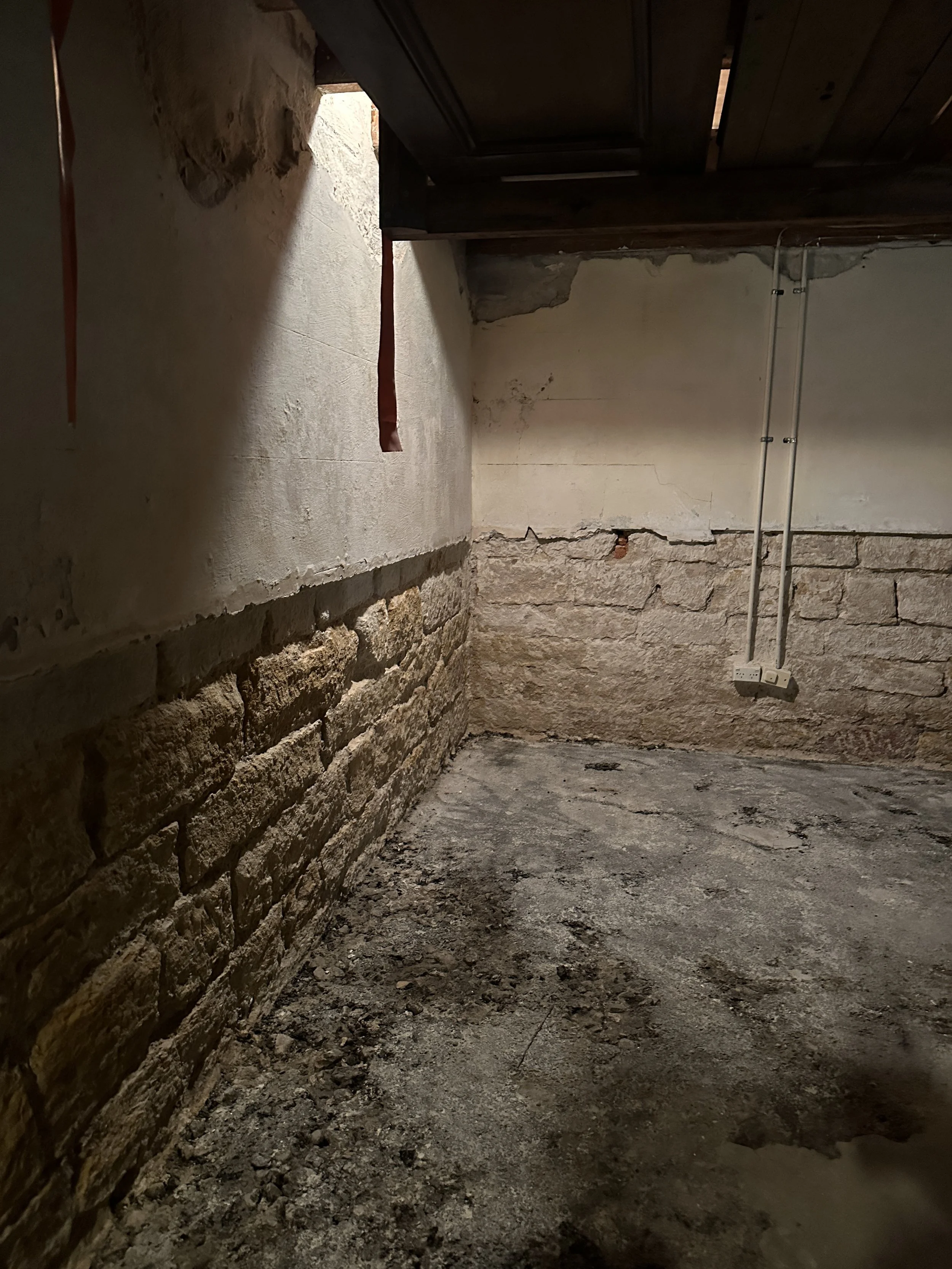 The first stage of works included remedial works to the sandstone foundation and basement walls, moisture-affected rendered and painted walls, and blocked air drains.